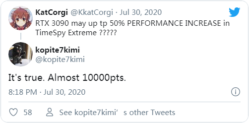 近段时间,社交网络上已经有许多可靠的泄密者透露了有关英伟达 RTX 3090 显卡的消息。比如昨日,当 @ KkatCorgi 在 Twitter 上询问 RTX 3090 的 TimeSpy Extreme 基准测试成绩是否较上一代大涨了 50% 时,@ kopite7kimi 就给予了相当肯定的答复。当然,在官方证实之前,事情仍有发生变化的可能。