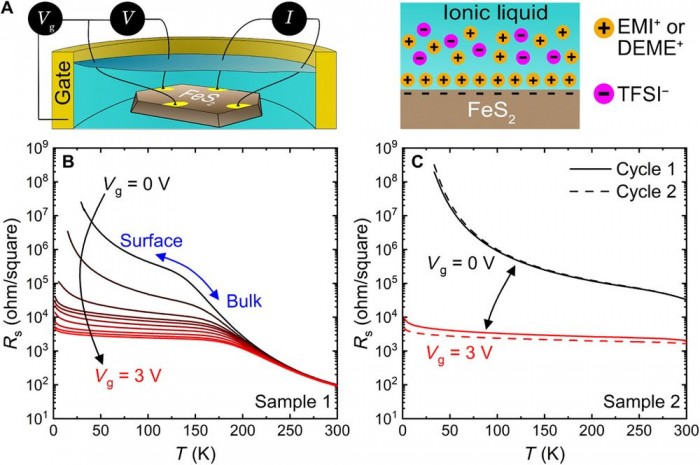 研究人员已经成功地在一种通常根本没有磁性的材料--黄铁矿(也称硫化铁)中诱发了磁性。在这项研究中,该团队使用了一种名为电解质门控(electrolyte gating)的技术。