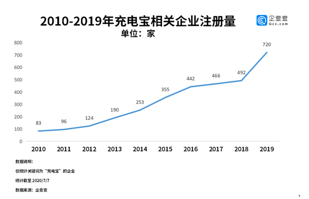 根据企查查数据显示,目前国内相关企业共有3564家,2019年新注册企业720家,同比增长46.3%。2020年1月至6月,我国充电宝相关企业注册量为 281家,其中第二季度注册量为174家,环比上涨62.6%。