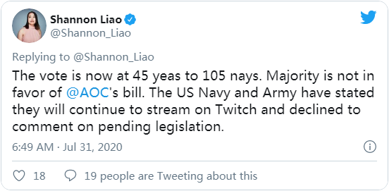 如果该法案获得通过,那作为五角大楼年度预算制定过程的一部分,众议院拨款委员会将不会为政府通过 Twitch 开展的征兵宣传支出买单。