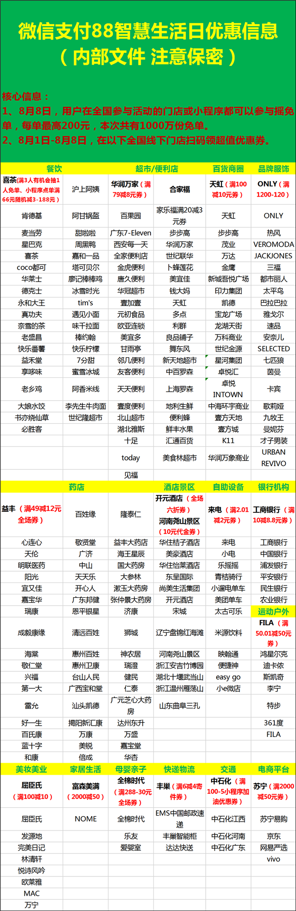 这些门店涵盖餐饮、超市便利店、百货商圈、品牌服饰、药店、酒店景区、自助设备、银行机构、美妆美业、家居生活、母婴亲子、快递物流、交通、电商平台等等各个门类,优惠方式也是多种多样。