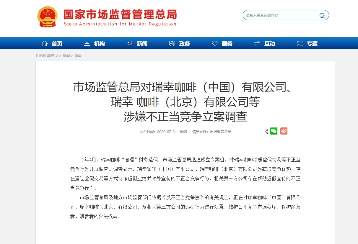 市场监管总局及地方市场监管部门依据《反不正当竞争法》的有关规定,正在对瑞幸咖啡(中国)有限公司、瑞幸咖啡(北京)有限公司,及相关第三方公司的违法行为进行处置,维护公平竞争市场秩序,保护经营者、消费者的合法权益。