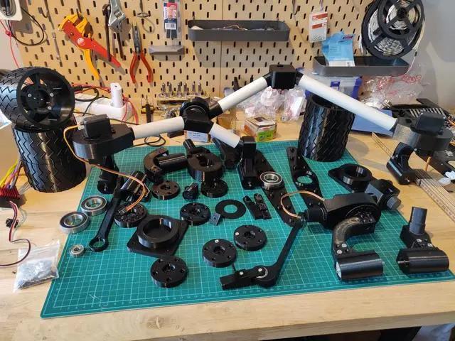 车轮方面,作者表示有两种选择,一种是原装好奇号风格的一体式车轮。一种是火星 2020 风格的轮子,分两部分印刷,外部部分可以用柔性塑料印刷,如 TPU。