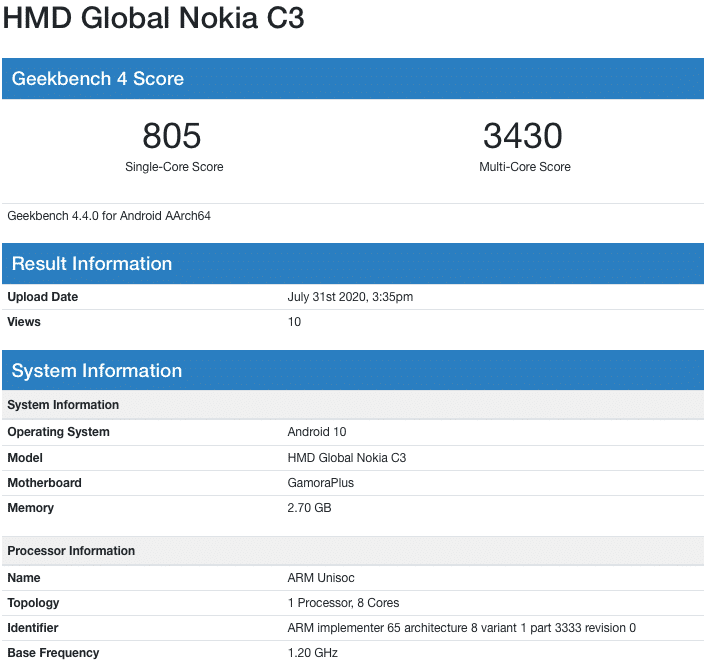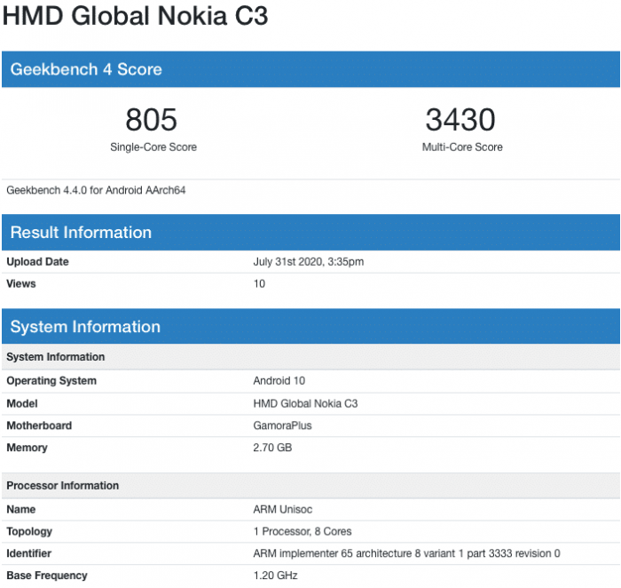 即将上市的诺基亚C3将运行Android 10操作系统。目前关于这款智能手机的其他信息很少,不过考虑到它是诺基亚C系列的一部分,并且使用了Unisoc芯片组,我们知道它将是一款入门级设备。这款智能手机在Geekbench上的单核测试成绩为805分,多核测试成绩为3430分,对于一款入门级智能手机来说,这是理所当然的。这是诺基亚C3两天内第二次出现在Geekbench上,不过需要注意的是,第一次并没有提到型号名称,但是相关数据显示,HMD Global将是制造商,采用GamoraPlus芯片组,Android 10操作系统。然而,它显示的是2GB内存,而不是3GB,这意味着诺基亚C3至少会有两种不同内容容量的版本。