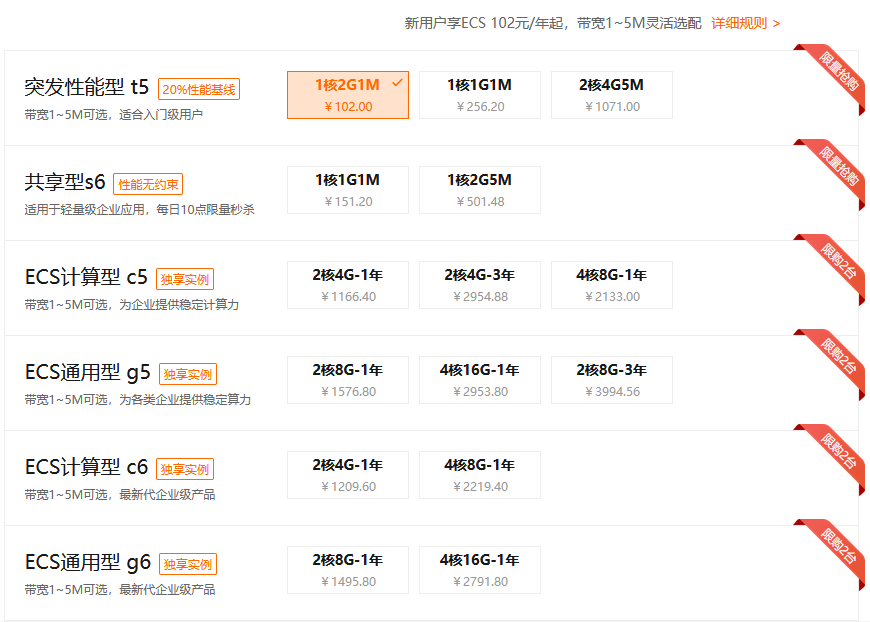 ECS突发性能 t5:1核2G内存、1M带宽 (个人新用户小博客推荐,经济允许情况下,不推荐该配置)