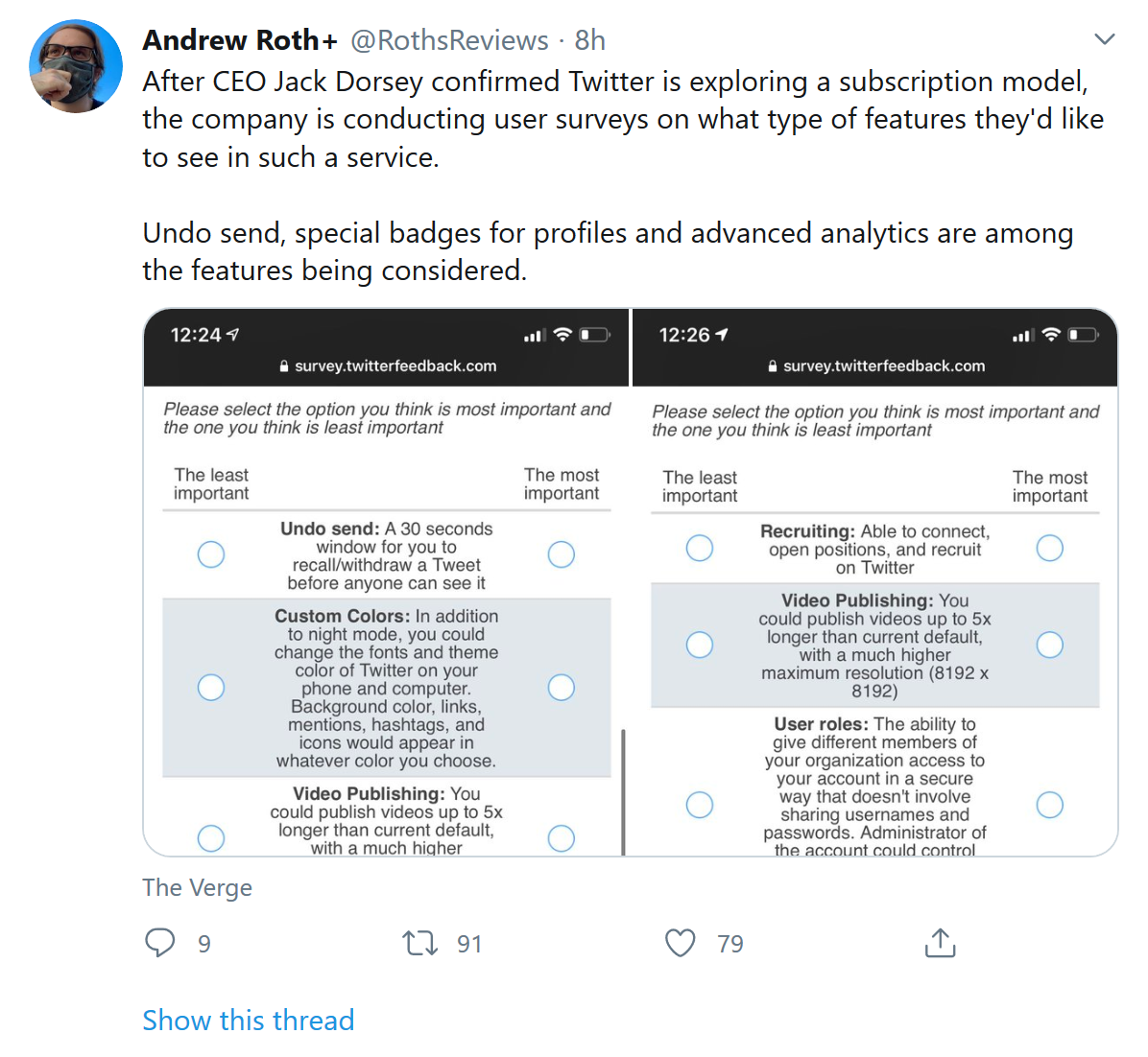 据外媒报道,记者Andrew Roth在Twitter上发布报道称,Twitter官方确认正在探索付费订阅模式的想法,现在该公司已经开始对用户进行调查以了解潜在的付费服务可能需要增加哪些功能。Roth的推文指出,Twitter显然正在考虑作为付费层的一部分的各种功能,包括在推文发送后立即撤销推文的选项、发布更长、更高分辨率的视频的能力。