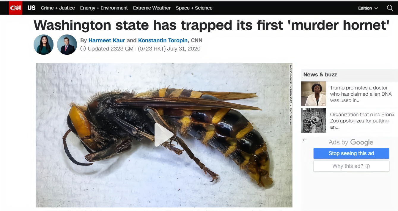 CNN说,自从去年12月首次在华盛顿州发现这种昆虫入侵以来,科学家们一直在努力进行捕捉。截止目前,该州已发现5只“杀手大黄蜂”。根据华盛顿州立大学专家的说法,它们身长超过2英寸(5厘米),是世界上最大的黄蜂,如果被其毒刺多次刺中,可导致人类死亡。