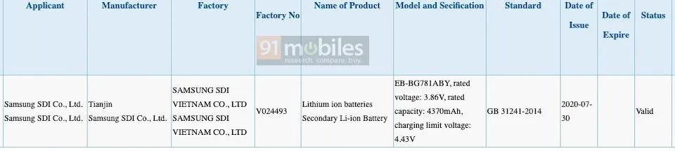 三星Galaxy S20 Lite又名S20粉丝版,相信很快就会作为Galaxy S20系列的一款平价入门机推出。这款型号为SM-G781B的手机此前已经在Geekbench上被发现,其中一些关键规格如处理器芯片和RAM被曝光,Galaxy S20 Lite还将针对特定市场推出4G和5G版本。现在,我们在3C认证网站上发现了三星Galaxy S20 Lite的电池,型号为EB-BG781ABY,从而确认了电池容量。
