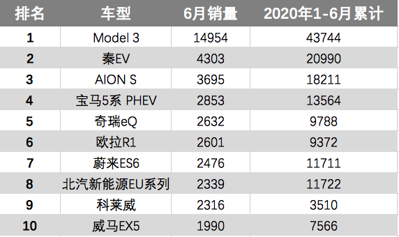 2020年6月新能源汽车车型销量排行榜,数据来源:乘用车市场信息联席会
