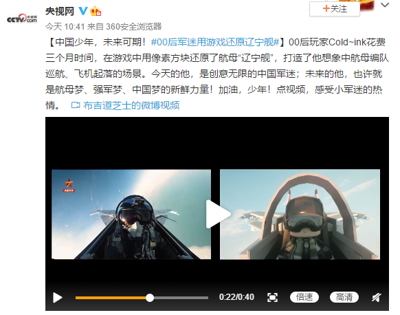 同样是游戏玩家,但这位ID为“ Cold~ink”却受到了央视的点赞。据央视网报道称,00后玩家Cold~ink花费三个月时间,在游戏中用像素方块还原了航母“辽宁舰”,打造了他想象中航母编队巡航、飞机起落的场景。