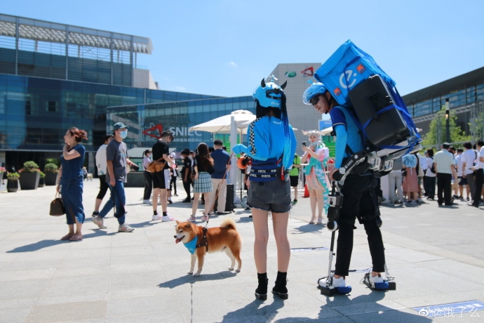 8月1日上午,第18届ChinaJoy进行到了第二天,现场出现了饿了么外卖小哥身穿“机械外骨骼”,尽管负重2大包物资,仍面带微笑,看起来非常轻松。蓝骑士身边还有头戴小恶魔头盔的小姐姐,以及一直戴着蓝围脖的秋田犬。