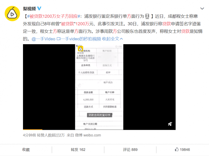 被贷款1200万女子上热搜 本人回应:浦发银行鉴定笔迹系单方面行为