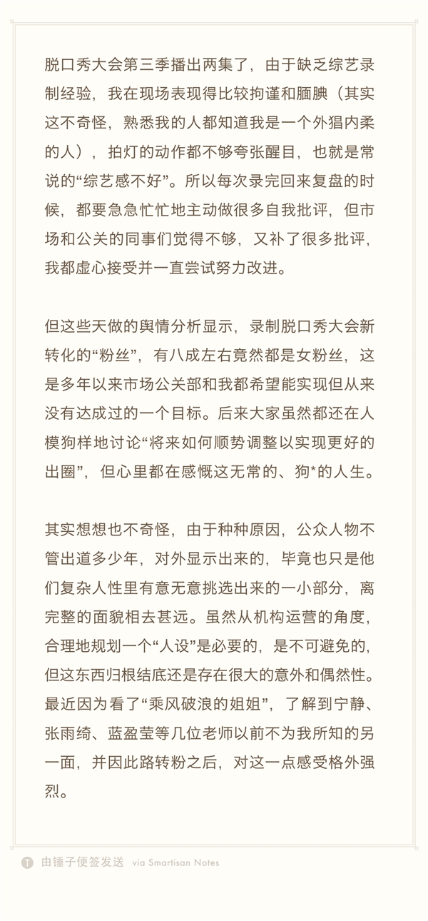虽然从机构运营的角度合理地规划一个人设是必要的,是不可避免的,但这东西归根结底还是存在很大的意外和偶然性。最近因为看了《乘风破浪的姐姐》,了解到宁静、张雨绮、蓝盈莹等几位老师以前不为我所知的另一面,并因此路转粉之后对这一点感受格外强烈。