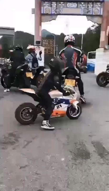 据悉,这位骑行迷你摩托的小孩,从视频中看只有六七岁,身高仅到成人腰部,头上戴着头盔、身穿黑色骑士服,俨然一位真正的“正规军”骑手。据在场目击者介绍,这位小孩的骑行速度并不慢,时速至少有三十公里了,非常危险。