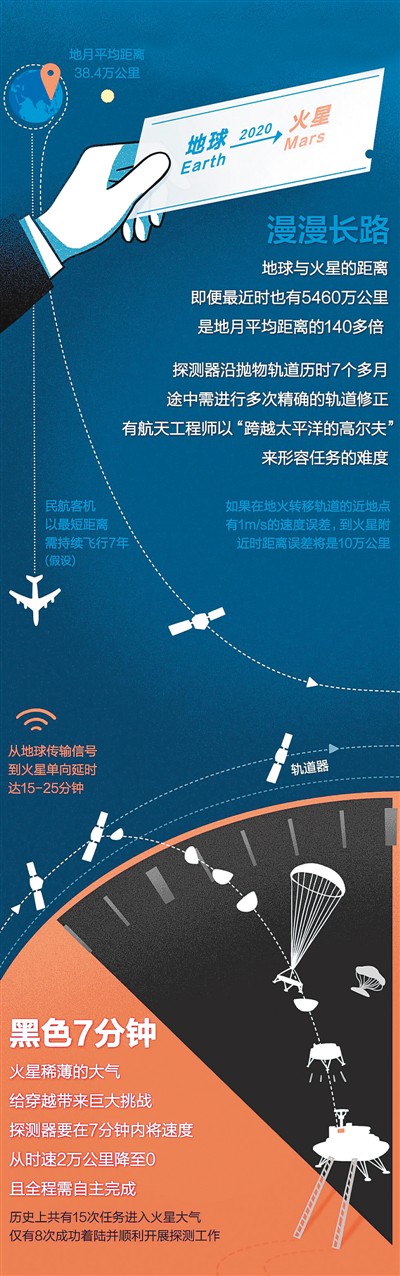 后续,天问一号探测器还将经历深空机动和数次中途修正,奔火飞行6个多月后抵达火星附近,通过制动被火星引力捕获进入环火轨道,开展着陆火星的准备和科学探测等工作。