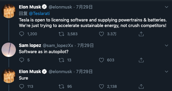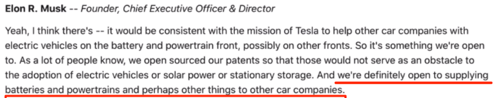 翻译过来就是:“特斯拉将会授权其他公司使用我们的软件(包括Autopilot),以及供应动力总成和电池。我们只是想努力加速可持续能源的发展,并非击垮竞争者。”