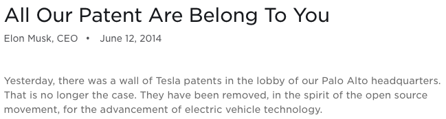 表面上逻辑好像是这样的,但不由得让笔者想起来6年前马斯克宣布“以开源的心态,分享所有特斯拉的专利”。一般来说,车企不仅要保护好自己的专利,还可能去“拿”别人的专利;特斯拉反其道而行之,直接公开分享所有专利。导致很多人不仅不相信这件事,反而认为马斯克定是“别有用心”。