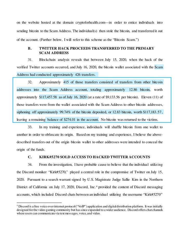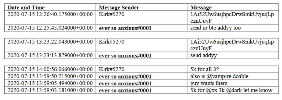 在攻击事件发生之后,美国 FBI 发现 Clark 在 Discord 上的网名称之为“Kirk#5270”。当时,他联系了另外两个人,帮助将牟取的比特币换成现金。