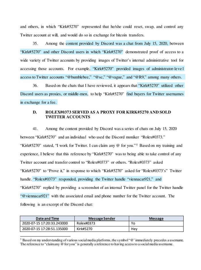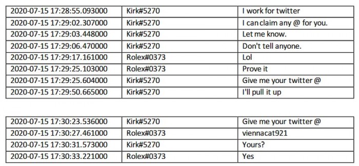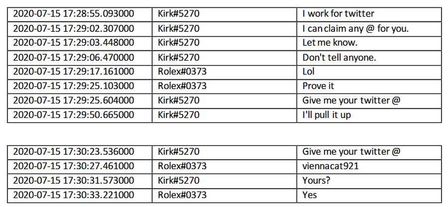 在聊天记录中,克拉克接近了另外两名黑客(Fazeli为Discord用户 "Rolex#037",Sheppard为Discord用户 "ever so anxious#0001"),并声称自己在Twitter工作。