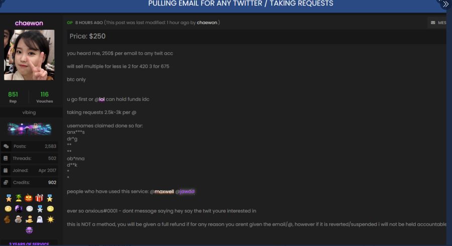 由于 Clark 让另外两人相信了他的权限级别,三人达成协议,在OGUsers论坛上发布广告,宣传克拉克劫持Twitter账号的能力。