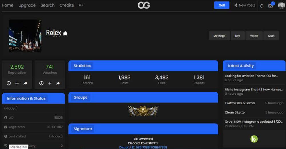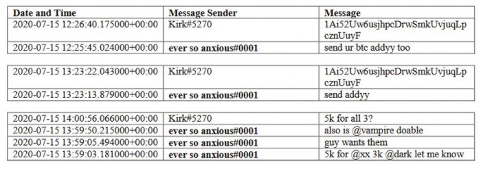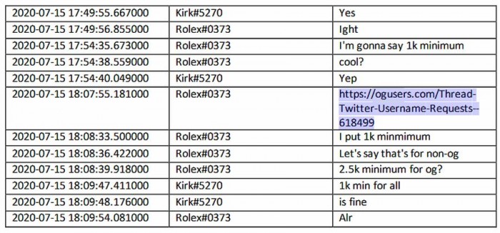 法庭文件中包含的聊天记录显示,克拉克(Discord 用户 "Kirk#5270")与 OGUsers 的 Discord 频道的另外两名用户接触,OGUsers 是一个专门为黑客出售和购买社交媒体账号的论坛。