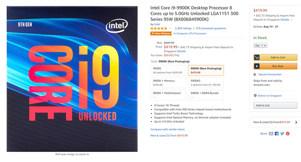 如今标准版包装的酷睿i9-9900K已经上架亚马逊了,重新使用了简单的方盒包装,目前售价419.99美元,比之前便宜30美元——不能说降价的部分全都是包装变化引起的,但这个十二面体带来的麻烦确实不小,运输成本也很重要。