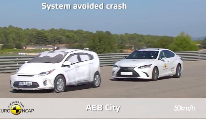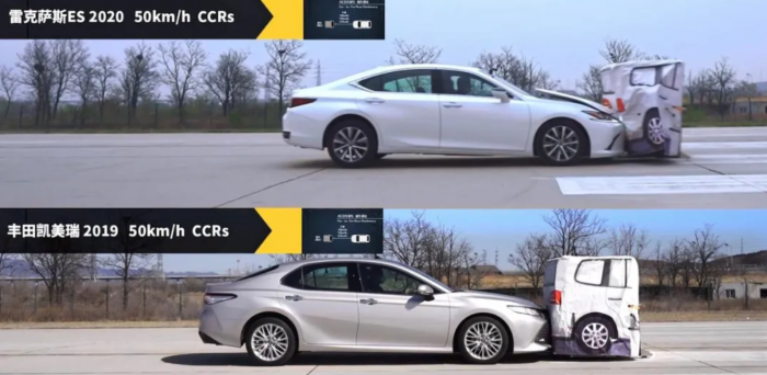 然而在车速提高到50km/h,雷克萨斯ES就没能及时主动刹停,撞到了前方的模拟车辆上。据专业人士介绍,出现这种情况,是因为车辆在50km/h以下速度是,AEB系统并没有完全介入,提供制动力。
