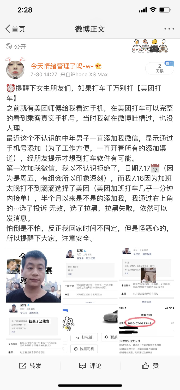 8月2日下午消息,聚合模式已经成为网约车行业的主流模式之一,但仍旧存在着一些问题。近日就有微博用户爆料称,在使用美团打车之后,用户手机号被泄露,从而遭遇司机骚扰。微博用户@今天情绪管理了吗-w- 发文称,7月16日晚间使用美团打车之后,7月17日以来遭遇一名陌生网友不断添加微信骚扰,她怀疑是司机拿到了打车时手机号码的个人信息。