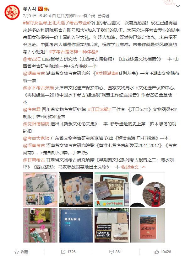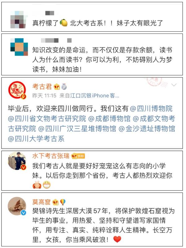 “冷门的考古圈又一次喜提热搜!现在已经有越来越多的科研院所官方账号和大V加入了我们的队伍,为高分选择考古专业的湖南耒阳女孩提供一份丰厚的入学大礼。年轻人加油,既然你已笃定信念,未来便不会迷茫。中国考古人都是你坚实的后盾,祝你学业有成。未来你就是乘风破浪的考古小姐姐!”