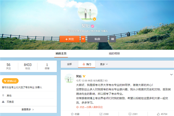 没想到这么多人对我报考的考古专业感兴趣,我从小就喜欢历史和文物,受到樊锦诗先生的影响,所以报考了考古专业。