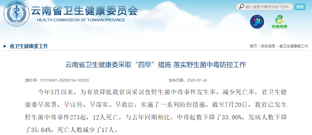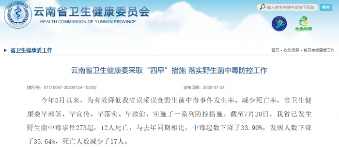 而根据云南省卫生健康委员会的统计显示,截至7月20日,已发生野生菌中毒事件273起,12人死亡,与去年同期相比,中毒起数下降了33.90%,发病人数下降了35.64%,死亡人数减少了17人。