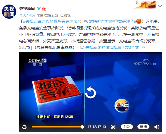 8月2日,据央视新闻报道,国家市场监管总局公告显示,对61批次网售充电宝产品进行检验发现,25批次产品不合格,不合格发现率为41.0%。