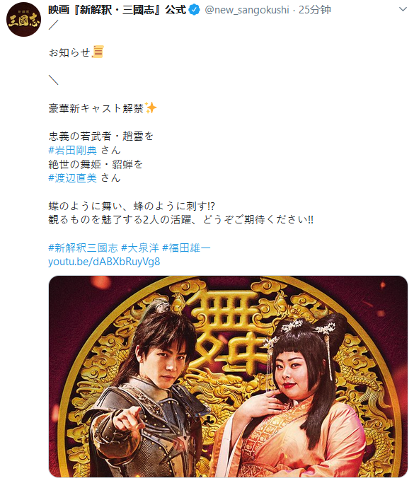 今日(8月3日),福田雄一电影《新解释・三国志》追加演员公布,由岩田刚典饰演赵云,渡边直美饰演貂蝉,不过,这个貂蝉看起来很丰满,有种恶搞的风格。与此同时,官方还公开了一段幕后制作影像,一起来感受一下丰满无比的貂蝉吧。