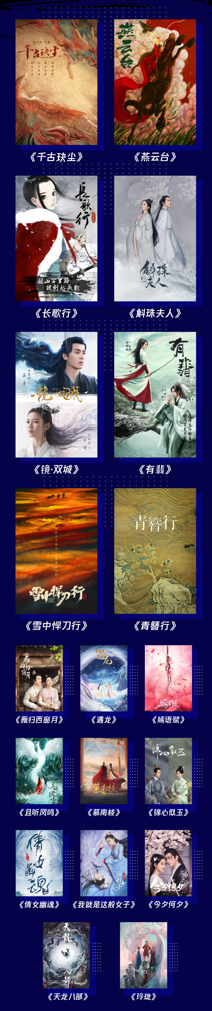 古风狭义主题,现场发布了周冬雨、许凯主演的《千古玦尘》,迪丽热巴、吴磊主演的《长歌行》,杨幂、陈伟霆主演的《斛珠夫人》,唐嫣、窦骁主演的《燕云台》,赵丽颖、王一博主演《有翡》及《青簪行》《镜·双城》等在内的片单。
