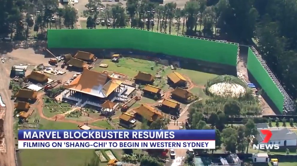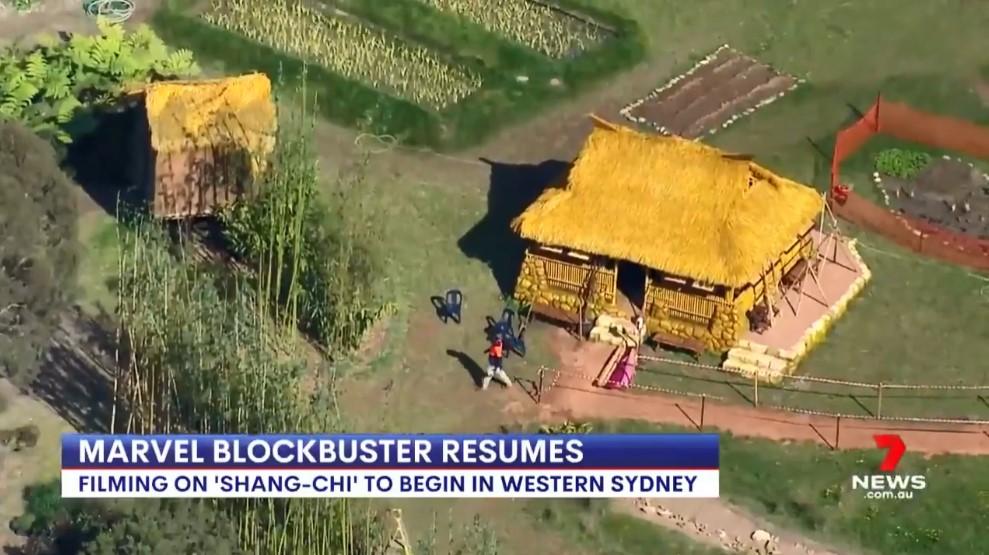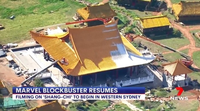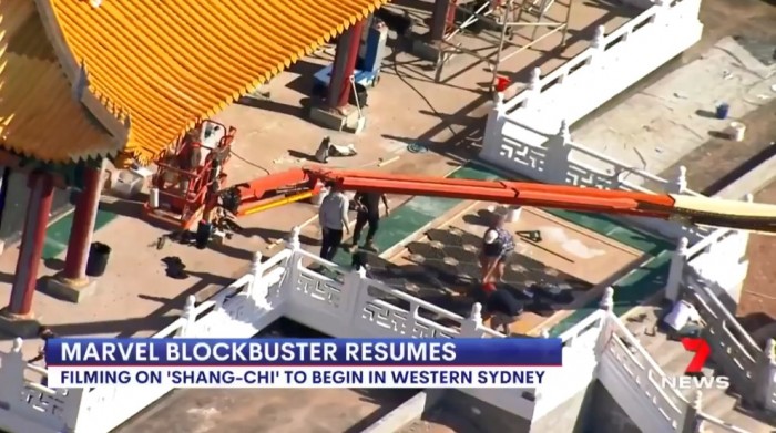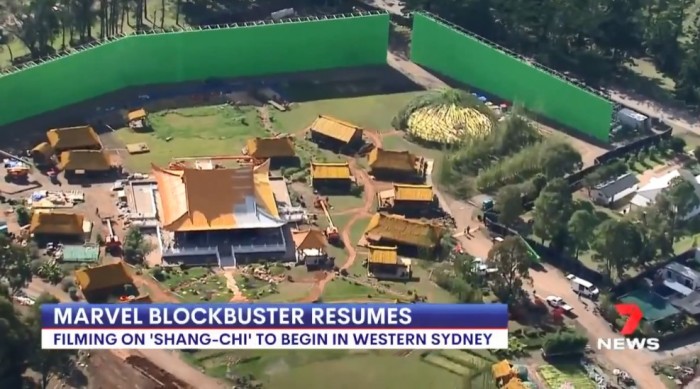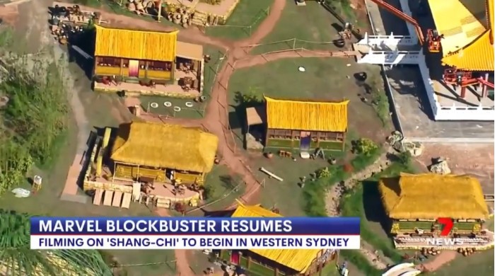 据澳大利亚媒体7news sydney报道的消息,漫威亚裔超级英雄电影《尚气》已经在澳大利亚恢复拍摄,同时还公布了一段片场外景视频,中国风的宫殿和村庄相当还原。澳大利亚媒体7news sydney称,他们的新闻直升机今天在悉尼西部捕捉到了这些场景,漫威当时正在为即将上演的《尚气与十戒传奇》搭建布景。