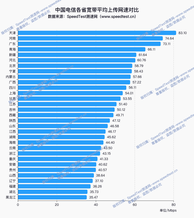 在平均上传数据中,天津市、河南省和广东省的网速较好,全国排名前10的城市中有8个是北方城市,排名后10的城市中有7个是南方城市。由此可见,中国电信在全国上传网速部署上,北方城市明显优于南方城市。