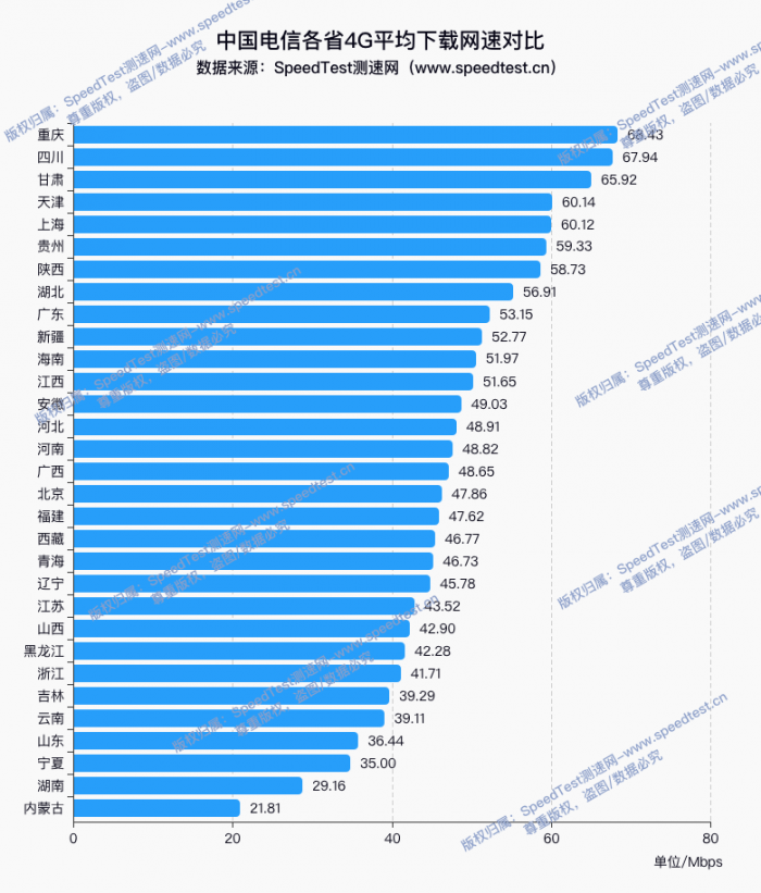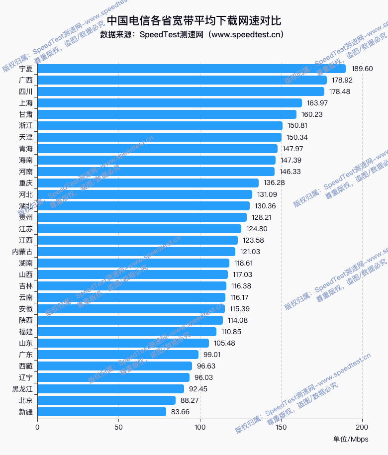 从2020年第二季度全国各省平均下载网速数据不难看出,中国电信在平均下载网速方面有着明显优势,全国80%以上的省份(自治区和直辖市)网速高于100Mbps,其中宁夏回族自治区、广西壮族自治区和四川省优势最为明显。