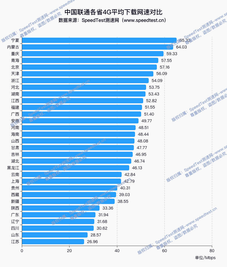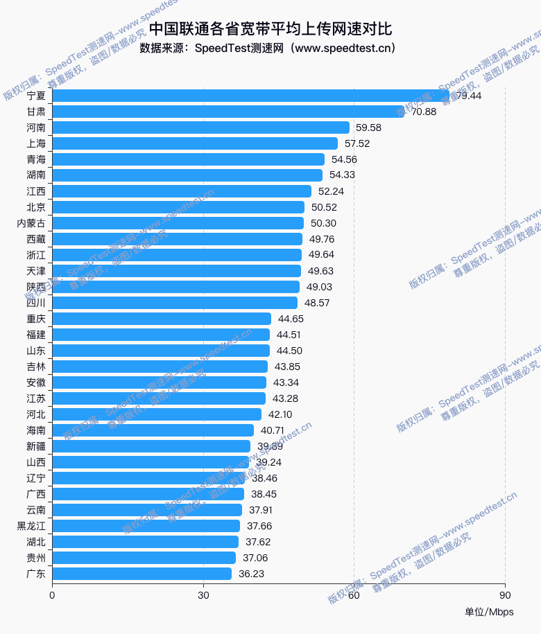 中国联通全国各省4G网络平均下载网速和平均上传整体趋势类似,在平均下载网速中,全国80%的城市基本稳定在63.33Mbps-38.55Mbps之间,新疆自治区到陕西省之前出现了5.19Mbps的小断层。
