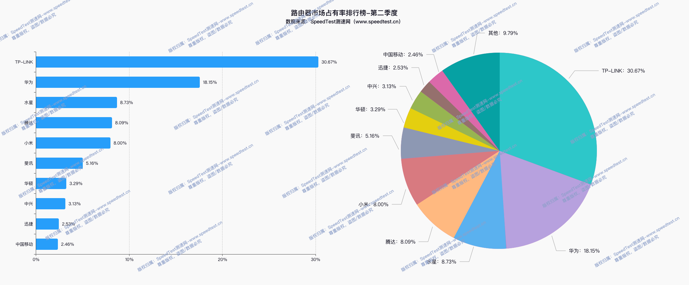 2020年第二季度全国路由器品牌市场占有率TOP5排名依旧是TP-link,华为,水星,腾达和小米,与第一季度相比,随着复工复产的进行,第二季度各大路由器品牌占有率都有所回升,TP-link从28.19%增长到30.67%,华为增长迅猛,从10.77%增长到18.15%,水星、腾达和小米都要不同程度的增长。在第二季度的全国TOP10排名中迅捷从原本的第七位下降到了第九位,中国移动成功进入排名。