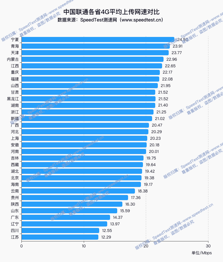 在平均上传网速方面,全国80%的城市稳定在24.53Mbps-19.17Mbps之间,从云南省到江苏省之间出现了每个城市近1Mbps的递减幅度。