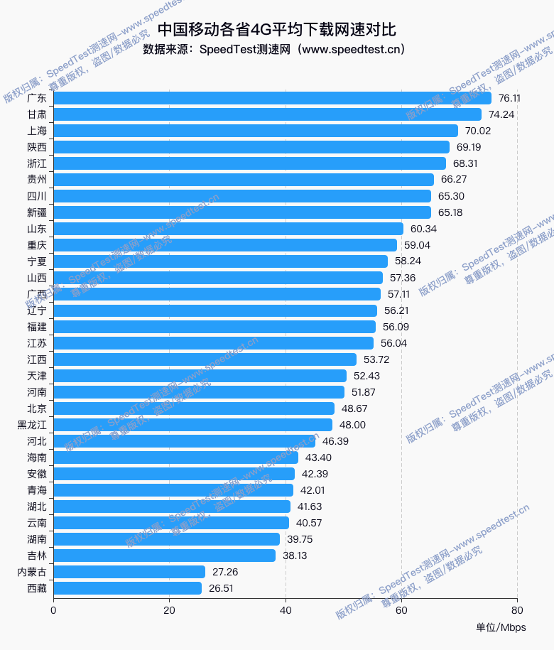 测速网大数据显示,中国移动全国各省平均下载网速呈现出“小阶梯状”分布。排名第一的广东省与排名第二的甘肃省优势明显,下载网速分别为76.11 Mbps和74.24Mbps,为第一阶梯;排名第三的上海市到新疆自治区,下载网速稳定在70.02Mbps至65.18Mbps之间,为第二阶梯;山东省到江苏省为第三阶梯;江西省到黑龙江省为第四阶梯;河北省到吉林省为第五阶梯,位列最后的内蒙古自治区和西藏自治区为第六阶梯,与另外前五个阶梯有较为明显的断层。