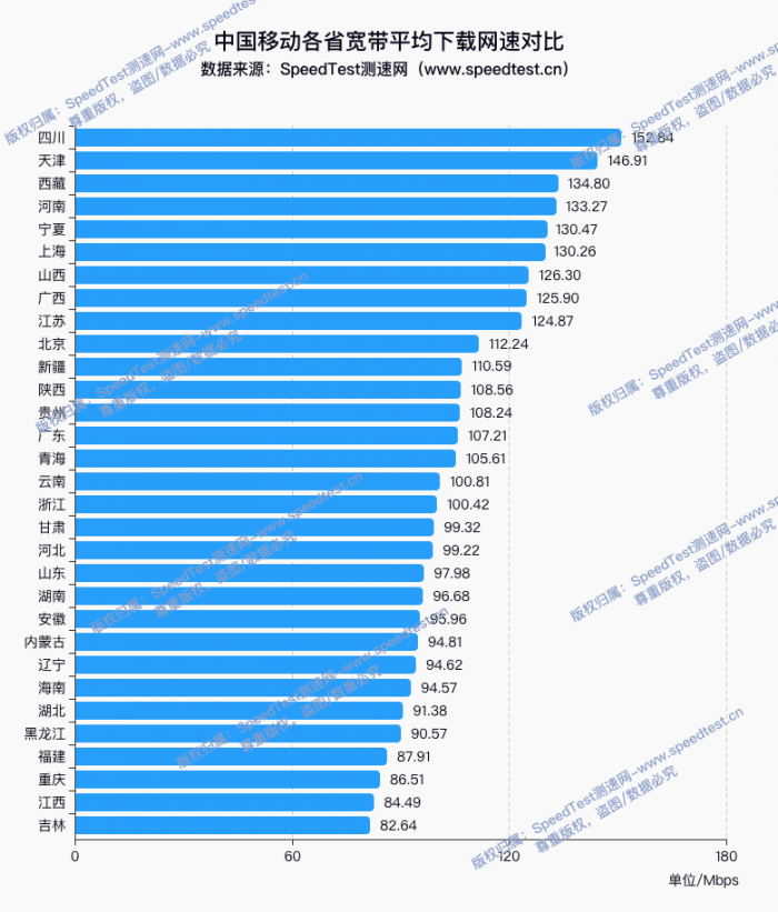 根据大数据显示,中国移动在全国各省的宽带平均下载网速方面呈现“阶梯状”分布,排名第一的四川省和排名第二的天津市,为第一阶梯;排名第三的西藏自治区到排名第九的江苏省,为第二阶梯;排名第十的北京市到最后的吉林省为第三阶梯,第三阶梯整体比较均匀,北京市和吉林省相差了29.6Mbps。