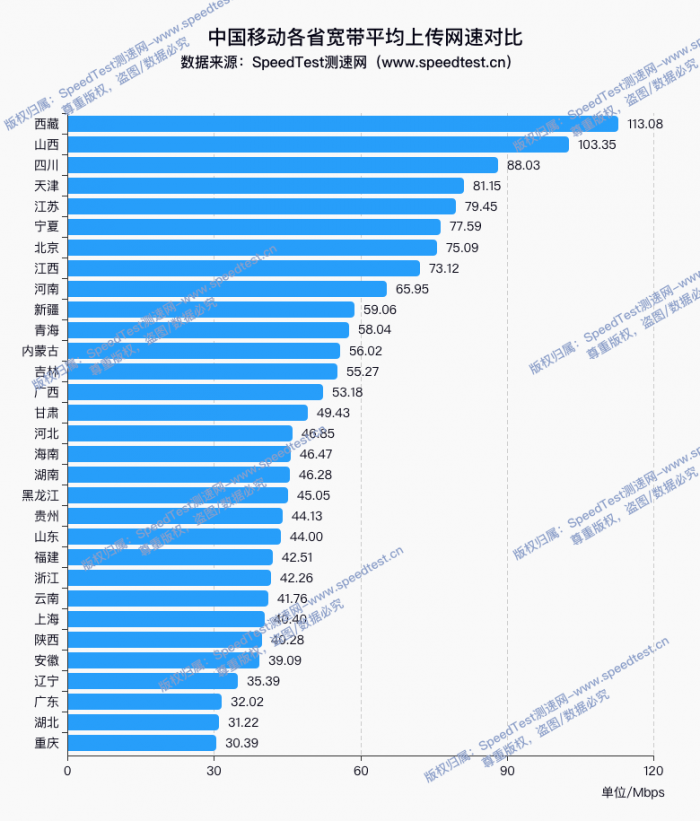 而全国各省宽带上传网速的均衡性明显弱于宽带下载,排名第一的西藏自治区的宽带上传网速达到113.08Mbps,比排名第十的新疆自治区高出了一倍的网速。纵向来看,排名前8位的省份,分别是西藏自治区、山西省、四川省、天津市、江苏省、宁夏回族自治区市、北京市和江西省,覆盖了全国大、中、小省份(直辖市和自治区)。可见中国移动在全国各省宽带平均上传网速方面虽有较大的差别,但在城市分布上相对均匀。