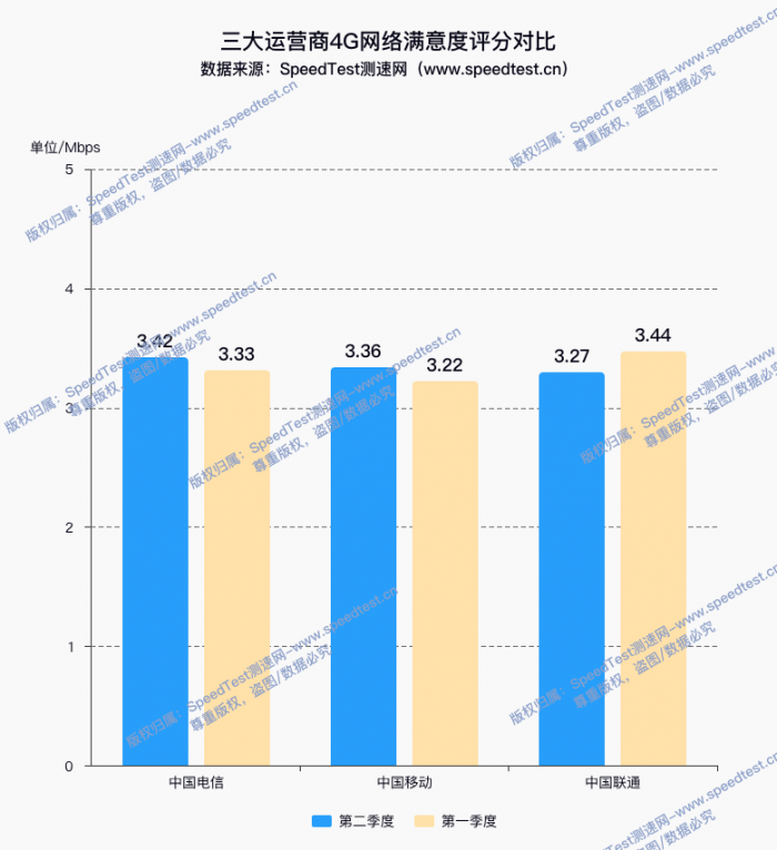 在4G网络方面,三大运营商的浮动都不大,但对整体排行有着不小影响,从数据上来看,中国电信从3.33分增长到了3.42分,中国移动从3.22分增长到了3.36分,中国联通从3.44分减少到了3.27分。中国电信以微弱的优势位列第一名,中国移动位列第二,中国联通排名第三,可见中国联通在4G用户好评方面还有很大上升空间。