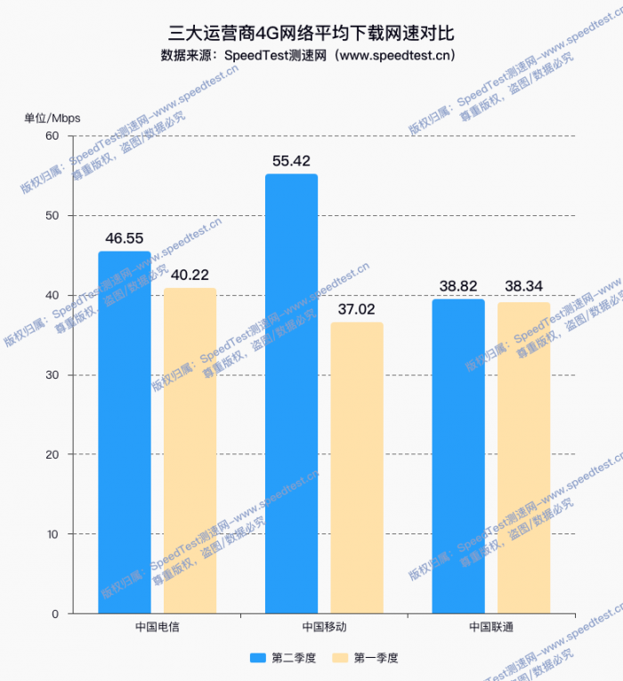 与宽带网络相比,三大运营商4G网络变化趋势更为明显,中国移动在4G下载网速方面实现了高速增长,从第一季度的37.02Mbps增长到55.42Mbps,增长率高达49.7%,成功超越中国电信和中国联通,位居第一。中国电信较第一季度增长了6.33Mbps,实现了15.7%的增长,而中国联通则与第一季度数值基本持平,位列第三。