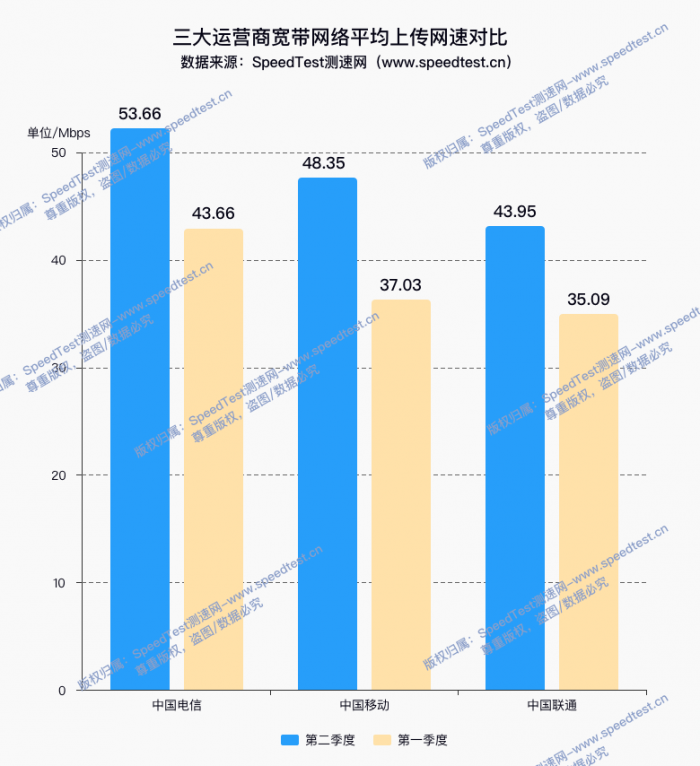 在平均上传网速方面,中国电信从43.66Mbps增长到53.66Mbps,较第一季度增长22.9%,中国移动从37.03Mbps增长到48.35Mbps,增长率为30.5%,中国联通从35.09Mbps增长到43.95Mbps,增长率为25.2%。由此可见,疫情过后,三大运营商在4G网速方面有明显回温。在本季度,中国移动的增长最为明显,但三大运营商整体形势不变,中国电信依旧位列第一,中国移动位列第二,中国联通位列第三。