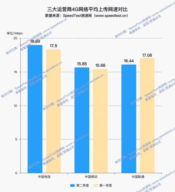 在平均上传网速方面,中国电信从17.5Mbps增长到18.89Mbps,较第一季度增长7.9%,而中国移动第二季度为15.85Mbps,与第一季度的15.68Mbps基本持平,中国联通首次出现负增长的现象,从17.08Mbps下降到16.44Mbps。从整体形式来看,中国电信位列第一,中国联通暂居第二,中国移动位列第三。