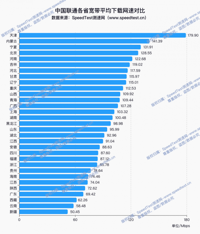中国联通第二季度宽带网络数据整体性差异变大,其中排名第一的天津市较排名第二的内蒙古自治区高出38.51Mbps,较最后一名新疆自治区高129.45Mbps。从整体数字上来看,排名前十的城市中,9个市北方城市,排名后十的城市中,8个市南方城市,可见中国联通在北方城市的宽带部署状况要明显优于南方城市。