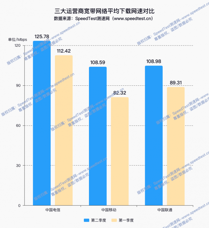 根据测速网大数据统计,三大运营商2020年第二季度宽带下载网速较第一季度有一定增长。中国电信从112.42Mbps增长到125.78Mbps,增长率为11.8%,中国移动从82.32Mbps增长到108.59Mbps,增长率为31.9%,中国联通从89.31Mbps增长到108.98Mbps,增长率为22%。中国移动和中国联通增长趋势较中国电信更为明显。从整体形式来看,中国电信依然位列第一,中国联通以0.39Mbps的微弱的优势位列第二,中国移动暂居第三。