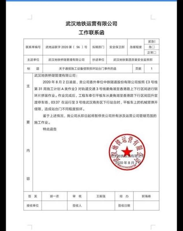此外,网上还传出一则武汉地铁运营有限公司工作联系函,送给武汉地铁桥隧管理有限公司,上面写着:贵公司委外单位中铁隧道股份有限公司按照《3号线第31周施工计划A类作业》对轨道交通3号线菱角湖至香港路上下行区间进行钢环片拼装作业。作业完成后,工程车牵引着平板车途经事发地时,平板车上的机械臂弹开侵限,造成站台门不同程度损坏。